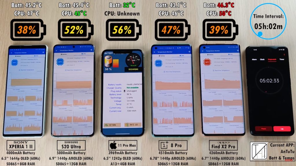 この時点で「OnePlus 8 Pro」は全体の3番目に位置しています。可もなく不可もなくといった感じ。「Xperia 1 Ⅱ」が仕様上バッテリーの消費が早いことが明らかであることを見るとやや消耗が早いとも言えます。