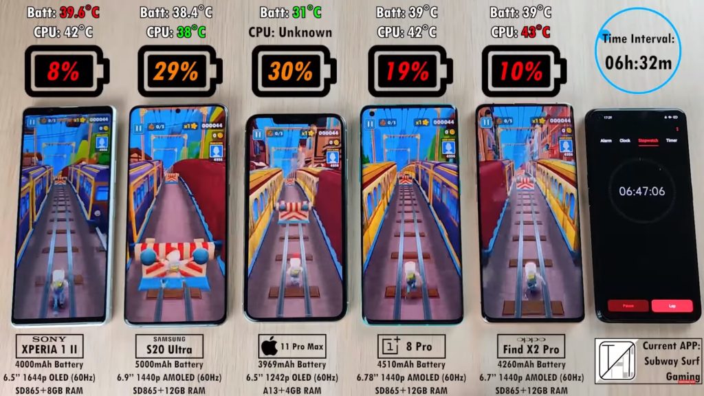 一般的に「iOS」は「Android OS」よりも電力効率が良いことで知られていますが、このテストではそれが分かりやすく出ているように見えますね。最も大きバッテリーを搭載する「Galaxy S20 Ultra」が「iPhone 11 Pro Max」と同レベルの持ち。この時点で「OnePlus 8 Pro」は3番目のもちの良さです。