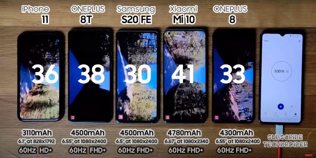 「OnePlus 8T」のバッテリーが約25%まで減った時点でのバッテリー持ちの差は上記の通り。ぶっちゃけ、このテストに出てくるスマホはどれもバッテリーの持ちが悪くないように見えます。一際目立っているのは「Xiaomi Mi 10」で2番手に「OnePlus 8T」に位置しています。