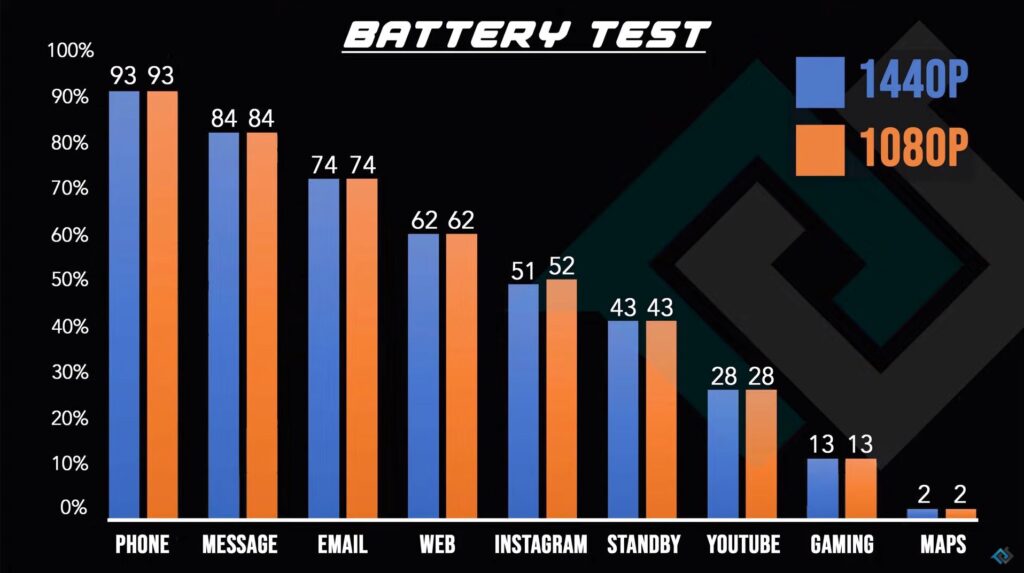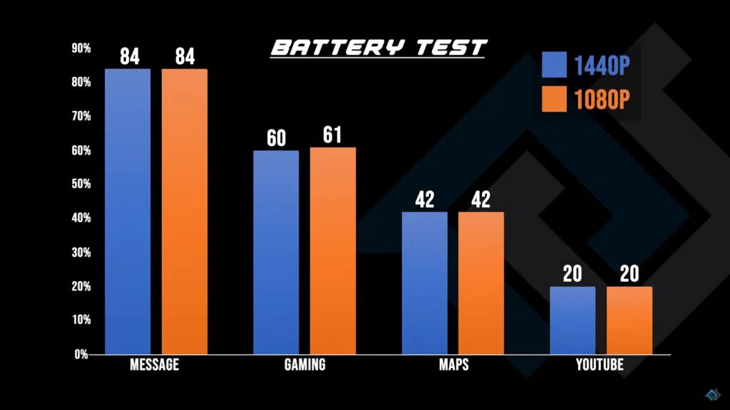 手元に同じスマホを2台用意できなかったのでYouTubeのPhoneBuffが行ったテスト結果を元に1080pで動作するスマホと1440pで動作するスマホのバッテリーの持ちの違いについて紹介します。
